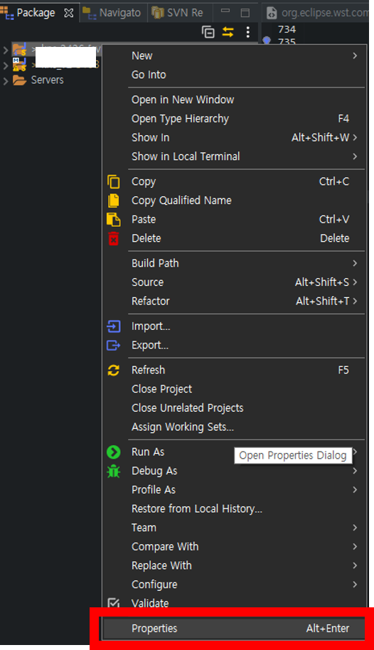 1. 작업중인 프로젝트 우클릭>'Properties'