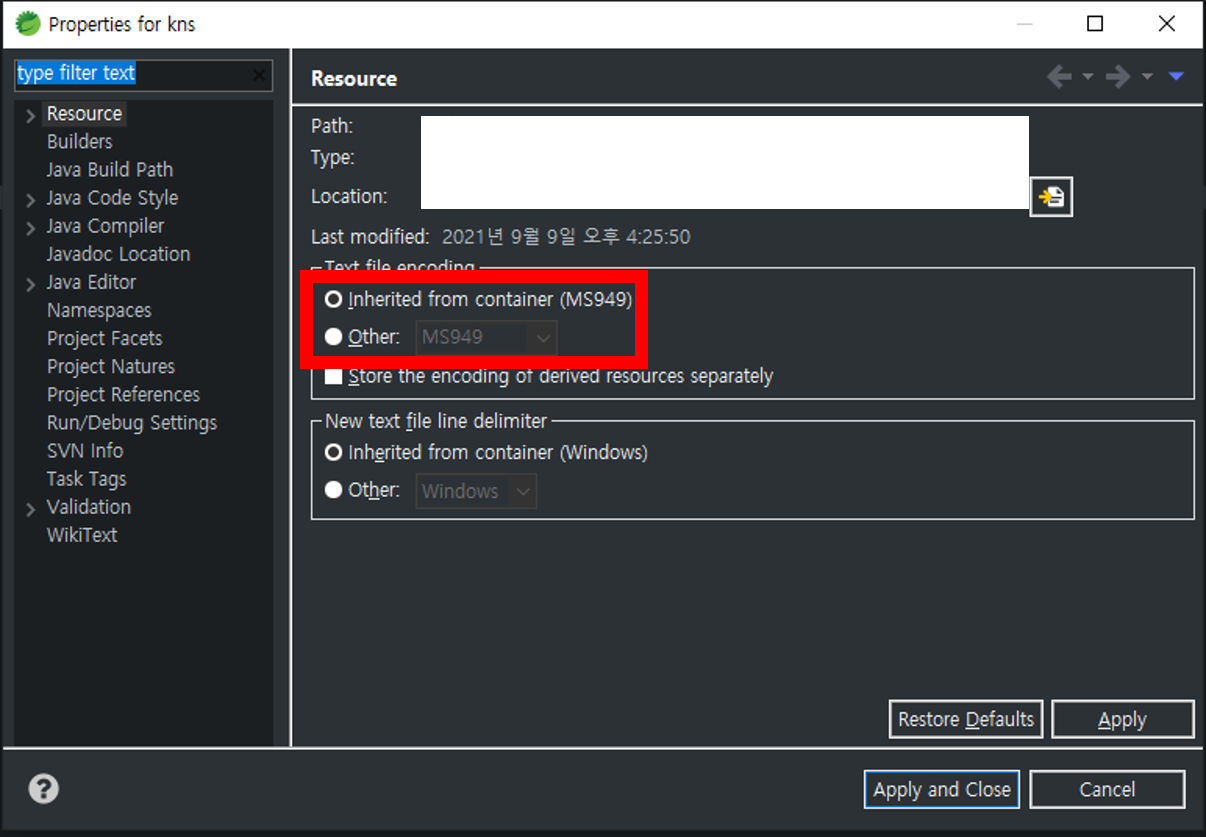 2. 저는 빨간 박스 안이 다음과 같이 'Inherited from container(MS949)' 로 되어있었습니다. 얘를 바꿔줘야 합니다.