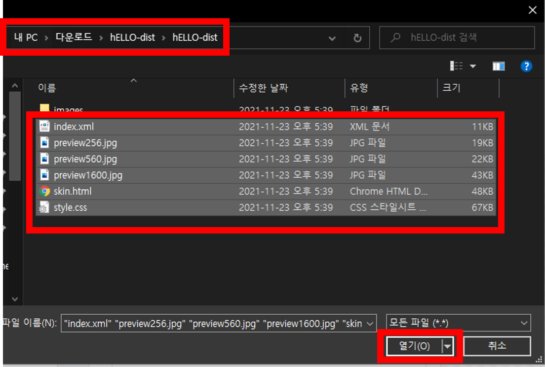 5. 1에서 압축해제 한 경로로 들어가, images폴더를 제외한 나머지 파일들을 다 선택하고 '열기' 버튼을 클릭해줍니다.