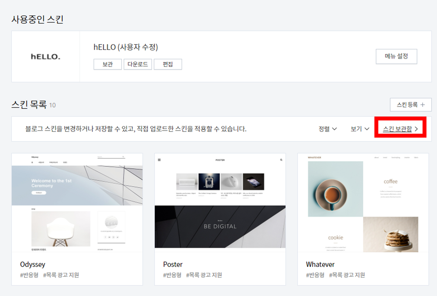 10. 그러면 2의 '꾸미기>스킨 변경'탭으로 전환이 됩니다.