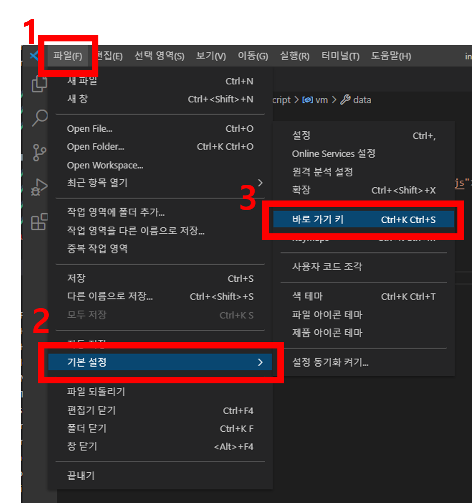 1. VS Code에서 '파일>기본 설정>바로 가기 키' 혹은 윈도우는 'Ctrl+k+s', 맥은 'Cmd+k+s'를 눌러줍니다.
