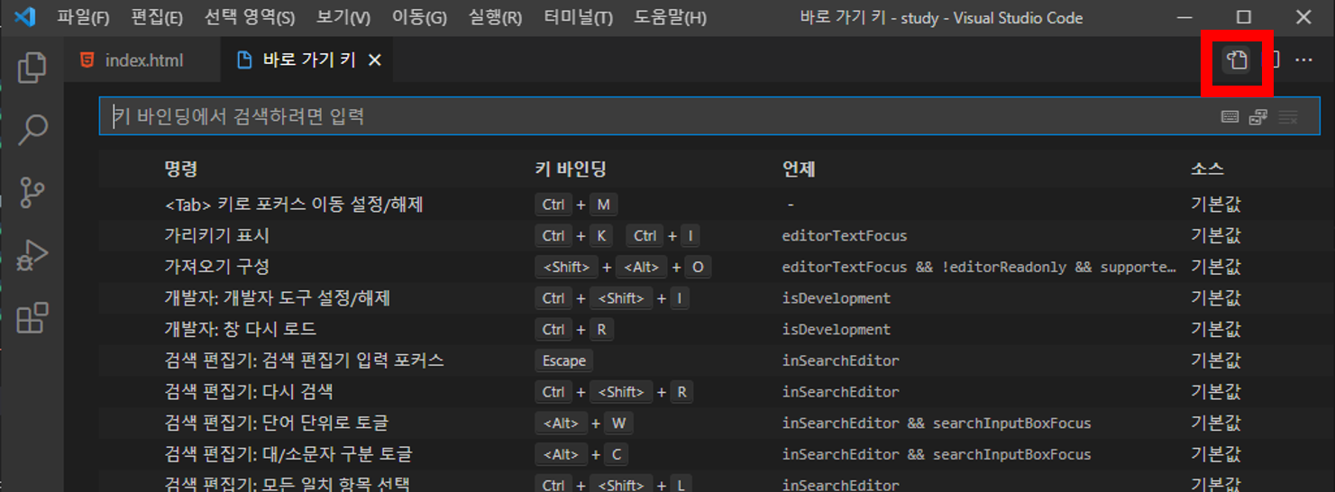 '바로 가기 키 열기(JSON)' 이라는 툴팁이 뜹니다.