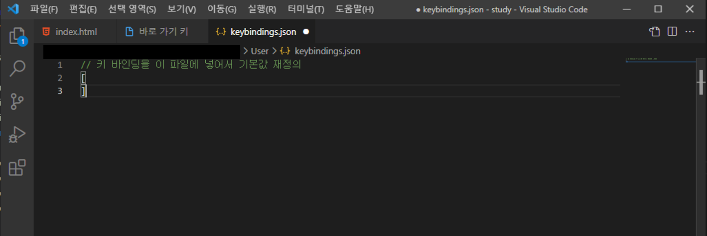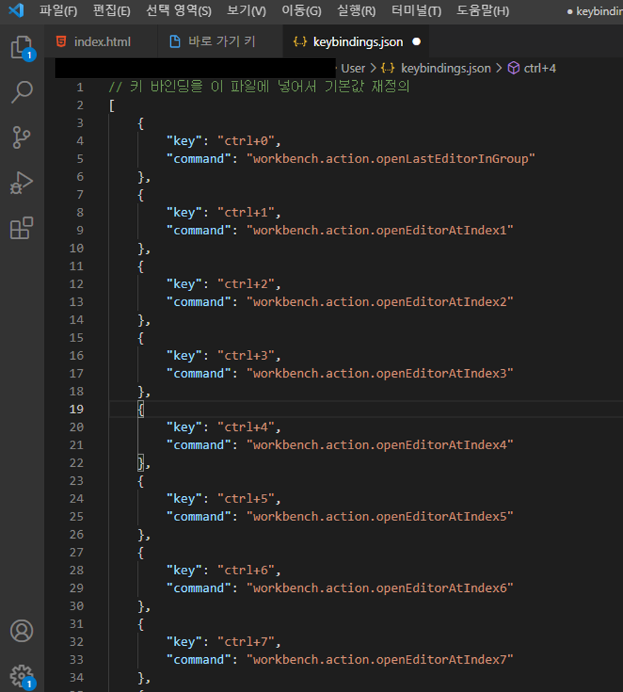 크롬이나 visual studio와는 달리, vs code는 탭들간에 빠르게 전환할 수 잇는 단축키가 기본적으로 설정되어있지 않습니다.