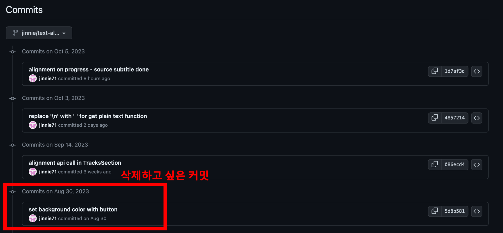 우선 Github repository에서 본 화면입니다. 저는 최신 커밋 세개는 그대로 두고, 하단에 있는 커밋 하나를 삭제하고 싶었어요.