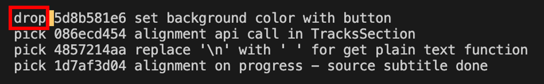 이 부분을 아래 사진처럼 drop으로 수정하면 해당 커밋이 삭제되는 것입니다.