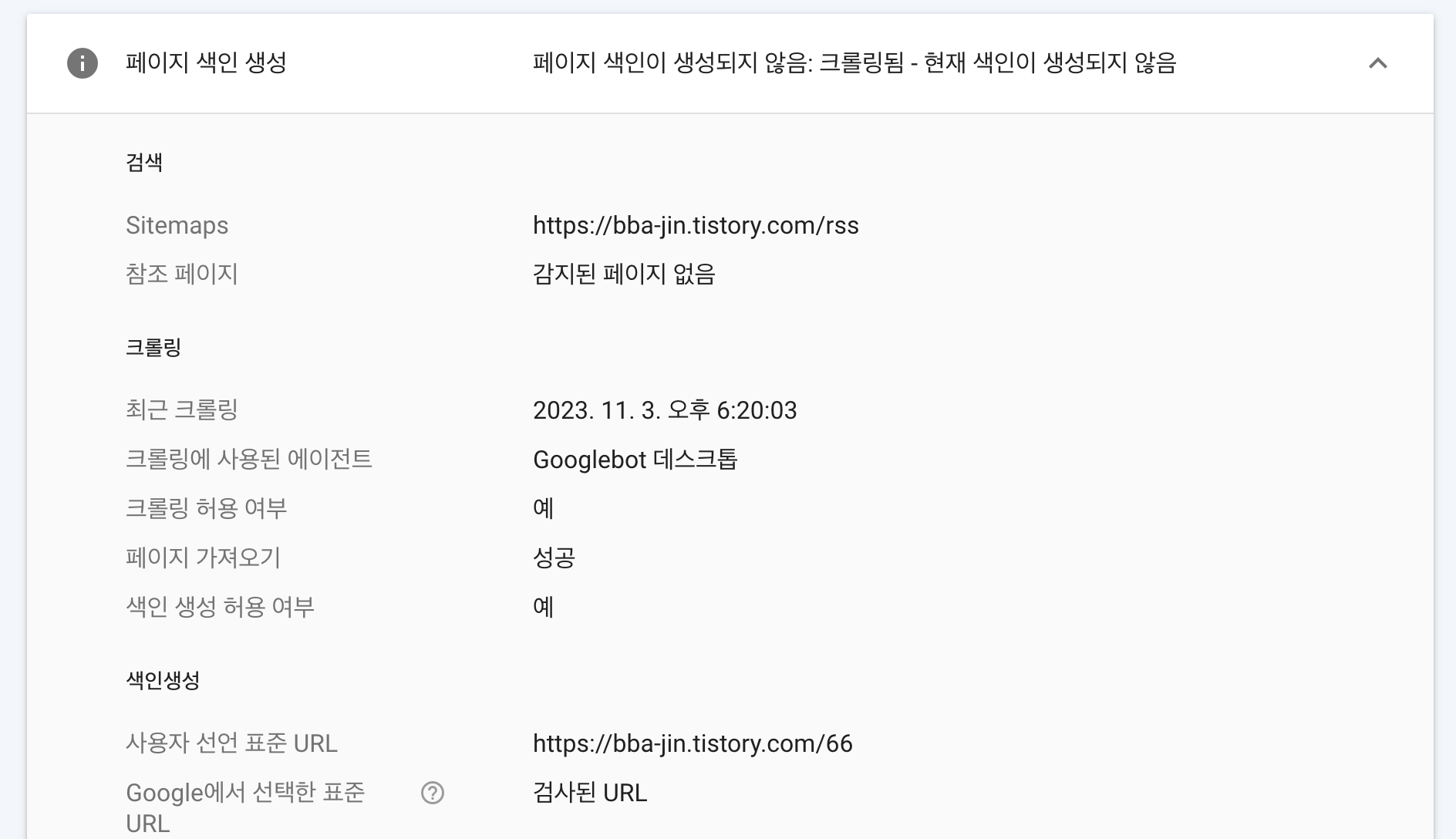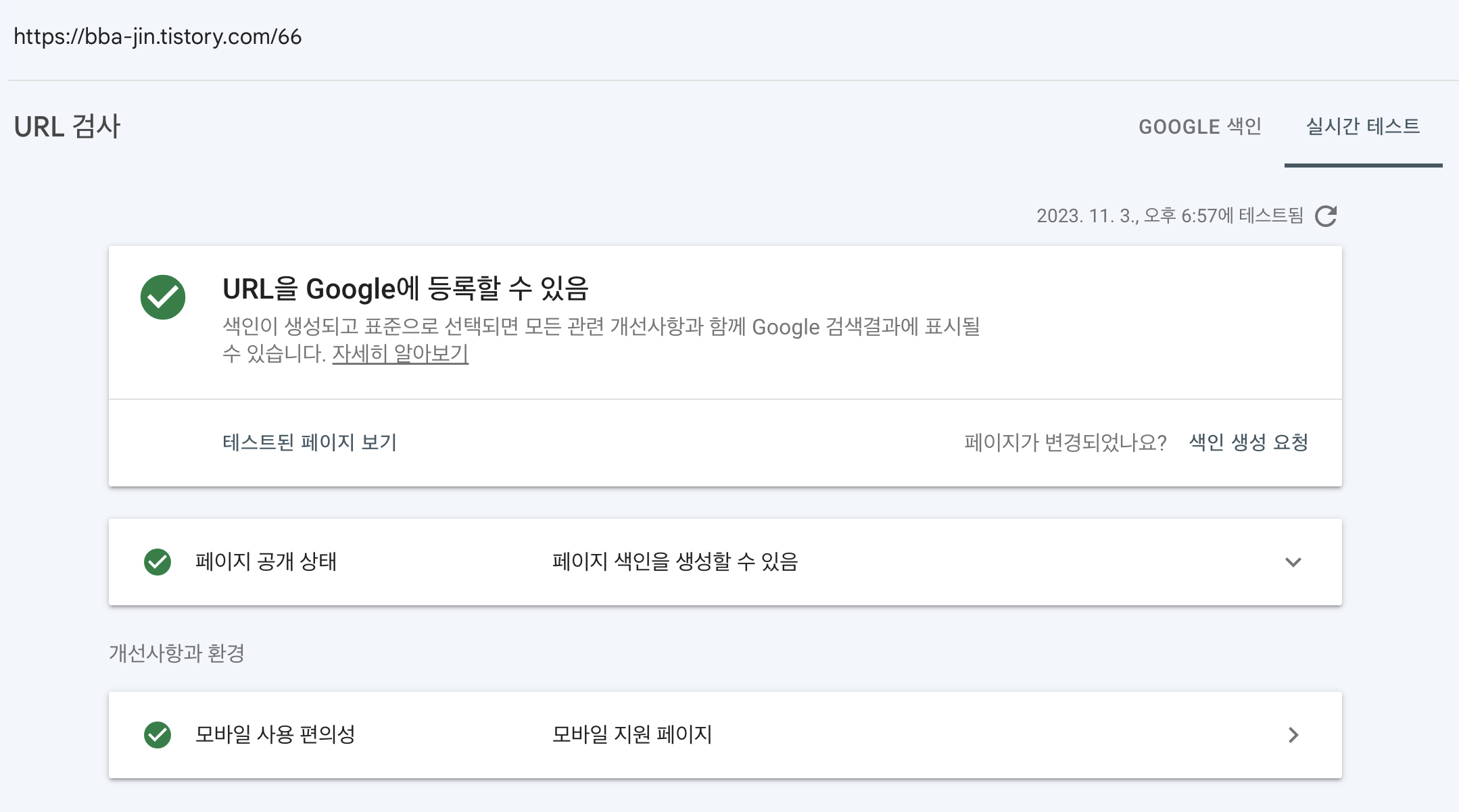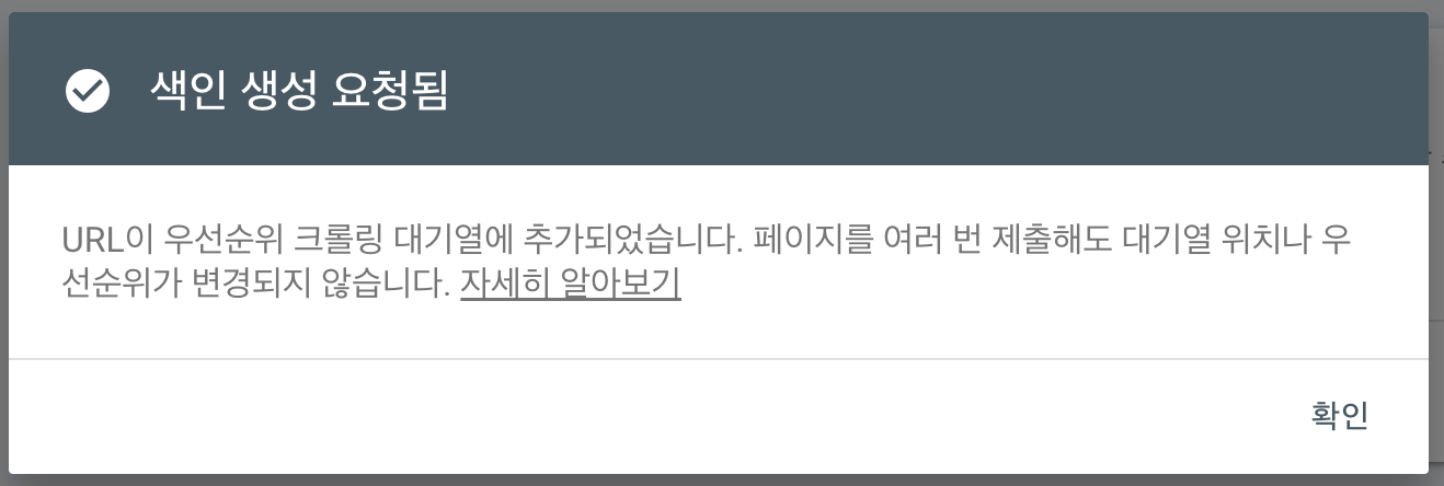 색인 생성 요청 등록이 완료된 지금은 아래와같이 나오고 있어요!