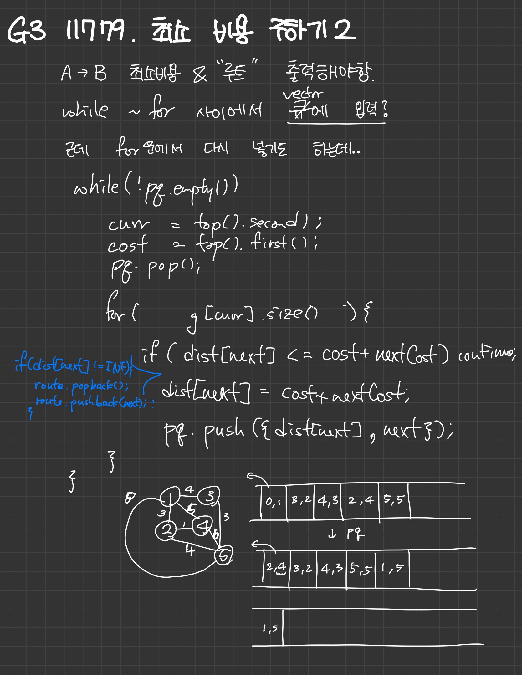 pq에 푸쉬를 하고, 이때 route역시 새로 갱신해줬다.