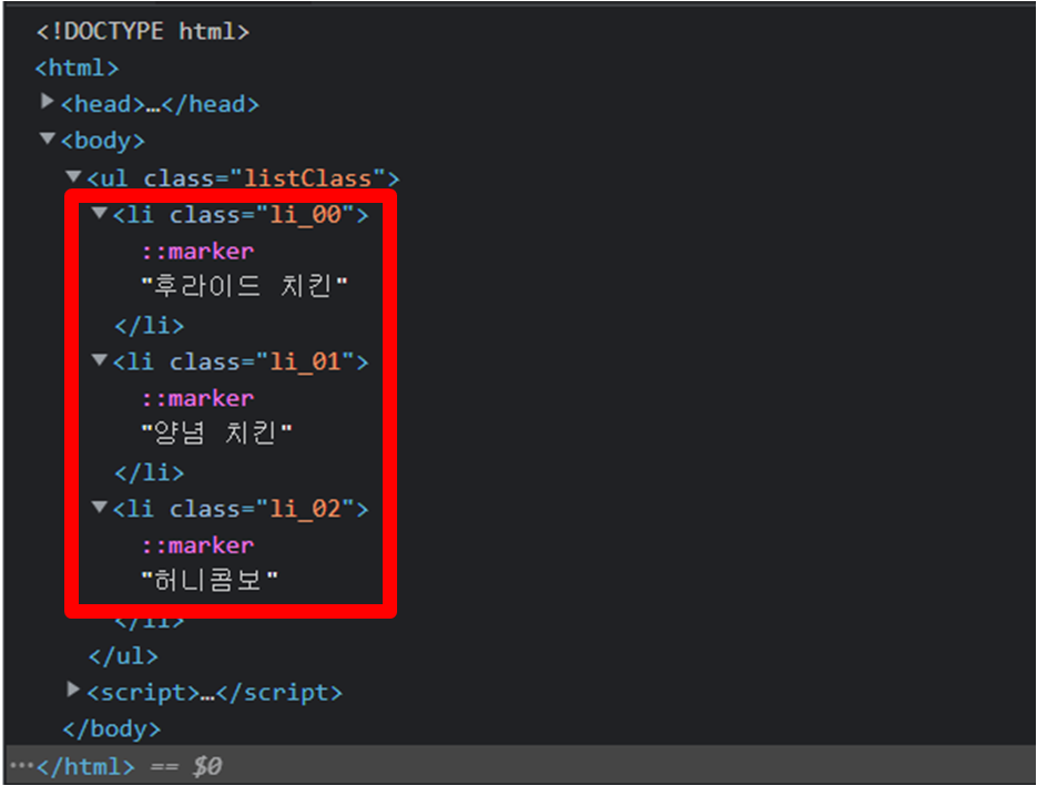 또한 크롬의 개발자 도구(F12) 를 보면 리스트부분의 코드가 다음과 같이 바뀌어져 있는 것을 확인할 수 있다.
